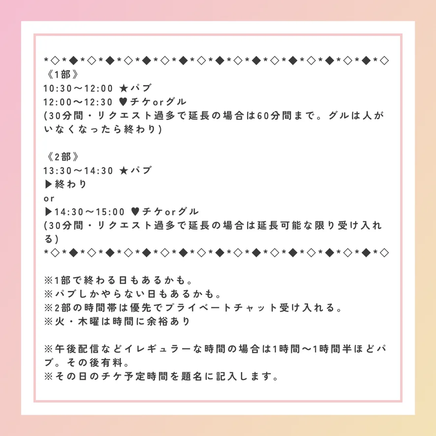🐣プライベートメッセージについて 基本はファンクラブメンバーのみ、配信がない日でもやり取りします。 配信中の配信内容に関することには返信することもあります。 また配信後、チップをくださった方からのメッセージはやり取りします。