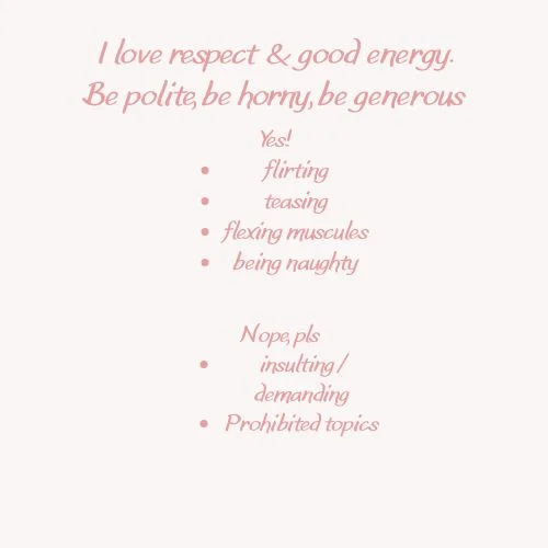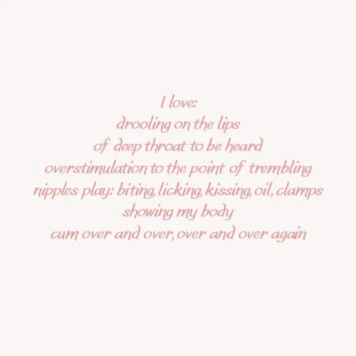 Smiskning, Erotisk dans, Högklackat, Kameltå, Striptease, Blottning, Massage, Nylon, Twerk, Topless, Kukbetyg, Onani, Fingrar, Ansiktssittande, Ahegao, Bröstklämmor, Oljeshow, Avrunkning, Fot Fetisch, Fotjobb, Avsugning, Spruta, Deepthroat, Gagging, Orgasm, Dildo eller Vibrator, Cowgirl, Sexleksaker, Doggy style